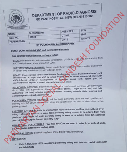 Sudhanshu is 4.5 yrs old boy, He loves cricket and like cartoons. He was full of life when he falls sick with high fever, his father is a labour , and salary packge (Rs- 8000/-). his parents have no idea that their child will diagnose with ASD device (Atrial Septal defect) he is labour and having 5 more family members in his family mother, father, wife and 6 years old daughter. Parivartan Social Sandesh Foundation would like to requests you to please help Sudhanshu, so he can fight with (Atrial Septal defect).